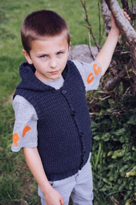 A boys textured buttoned vest with a plain hood and a pocket, a perfect layer for a treasure hunter out for an adventure.