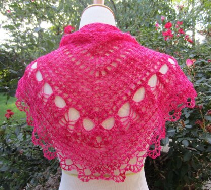 Alexis is a feminine and lacy heart-shaped scarf worked in lace-weight yarn. It begins at the center-top with 11 chains and continues to grow wider and deeper as each row is worked. After blocking, Alexis is 43.5 inches (110 cm) along the top line from tip to tip and 20.5 inches (52 cm) deep. It is a flexible piece that can be worn with the point in the front, at the side, or in the back.