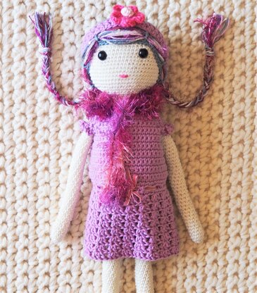 Your crochet doll will be approx 55cm using DK yarn, along with pattern for a dress, shoes, scarf and flower headband all of which are removable.