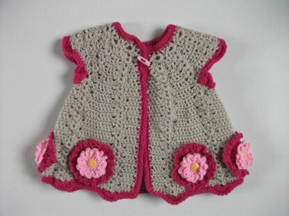 A pretty little top for a pretty little girl. Lovely summer flowers adorn this top. Flowers are made seperately and sewn on at the end. A very easy top down construction to make.