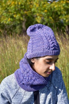 The hat and accompanying cowl feature two types of cables and a tweed stitch block, which uses slip stitches and yarn in front/back movements. Both patterns are included in a single download.