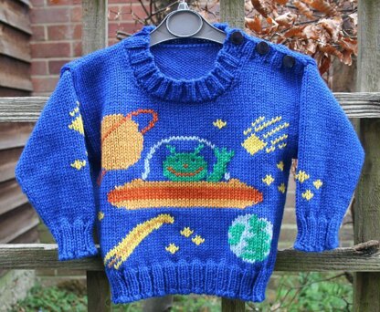 Toddlers will love having their own little green friend on this sweater! Add space motifs to keep him company or leave him as a single motif. This sweater is knit flat on two needles using DK yarn. The motifs are added using Swiss Darning (duplicate stitch) after knitting the sweater pieces, however they could be added as you knit using the intarsia method.