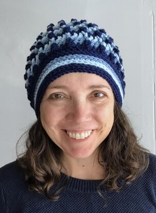 A fun color play hat choose 1 color, 3 colors or more. The hat is loaded with texture with front post stitches and front post clusters. It is a quick project worked from the top down to the brim. Make it in shades of blue to donate to #HatnotHate. This is an easy to intermediate pattern.
