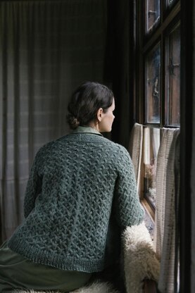 This top-down, cabled cardigan, named for “the beginning” in Finnish, features inset slit pockets. The front’s long, dramatic V-shape meets at the waist. Reverse stockinette triangles at the underarm create Alku’s A-line shaping.