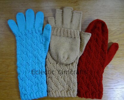 The only pattern you will ever need. (You can chose other stitch patterns provided they have the correct stitch count). This pattern contains gloves, mittens and their convertible versions and is designed to be worked in the round. I use 2 circular needles but they can also be made using other circular methods. The finger cover is patterned on the back and plain on the front just as the mittens are.