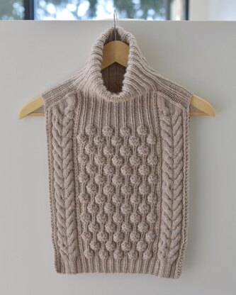 Alpental Neckwarmer is a striking modern accessory that pairs large textured bobbles with classic cables. It is first worked flat in two pieces. Then, shoulder stitches are cast on using the backwards loop cast-on method and the piece is worked in the round with shoulder decreases on both sides. After shoulder decreases are completed, the turtleneck collar is worked until the desired length.