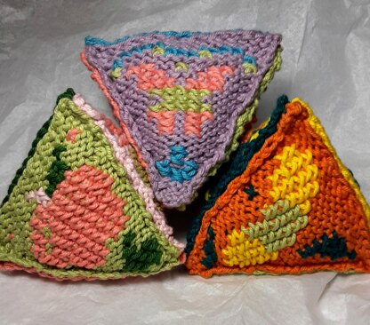 100% cotton suggested. Knit Pick Dishie yarn colors. Apple A colors blush, honeydew, jalapeno, conch; Butterfly B colors azure, lilac mist, honeydew, conch; Caterpillar C colors kenai, honeydew, bumblebee, clementine. 20 yards each color. Edges 4.25 inches. Height 4 inches.