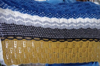 MATERIALS Nova, Earth Collection Alpaca Peru [100% baby alpaca 109yds/50g]; MC 530 amber, 2 skeins; CC2 1430 smoke, 1 skein; CC3 1400 natural, 1 skein; CC4 540 denim, 2 skeins.