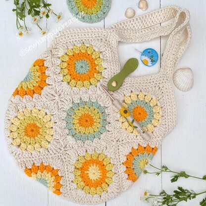 The pattern is written in U.K. terms with US terms for ease of conversion. Our Granny Square crochet bag uses granny sunburst motif granny squares, joined using a continuous join with some simple stitching to complete. Included in our pattern is our interpretation of a continuous join tutorial, and a full photo tutorial with “map” to guide you though. We have given quantities for the joining shade and the other yarn used. for stash. A Traditional Granny Square pattern: with a photo tutorial for making our bag, (we do not include how to line the bag, pattern is for making the bag only.) Although I have included my notes & photo of my measurements on how I lined my bag, bag size not including handles is 12.5” (32cm)high by 12” (30.5cm)wide when worked to the gauge on the pattern. I'm a U.K. designer al my patterns are in U.K. English crochet terms
