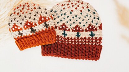 The Mushroom Beanie Hat is worked in rounds from bottom-up, in fair isle crochet.