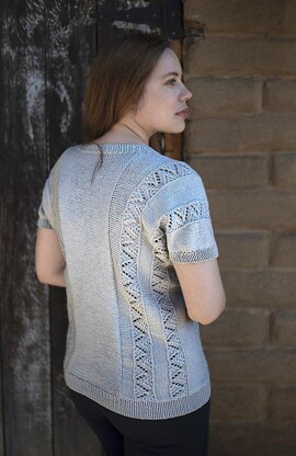 This top is worked in part from the bottom up and partially sideways. First, the center back and front panels are worked. Then, the stitches for the right side are picked up along the edges of the central panels, and the front and back right sides are worked at the same time to the side “seam”. The left sides are worked in the same manner. The open stitches of the sides are joined with a 3-needle bind off.