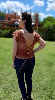 The Amarula Top is a relaxed to semi-fit design, adjustable by the back strap. It is crocheted in herringbone DC stitch and it´s considered an intermediate level pattern.