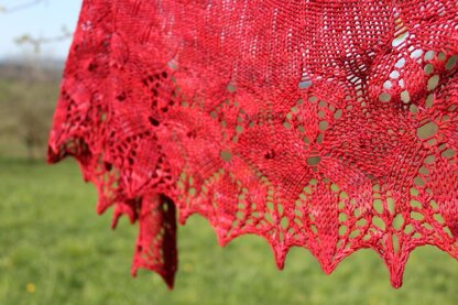 Crescent-shaped top-down shawl with an easy-to-work knit and purl body and a beautiful floral border. 3 sizes, charted and written directions.