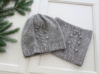 Decorative cable and bobbles, reminiscent of a sprig of entwining vine with flowering buds, adorns the side of the Amelia cowl and hat. With a moderate slouchy silhouette, the sassy hat is a perfect companion for the toasty cowl. The matching set is knitted seamlessly in the round from the bottom up, and can be easily adjusted in circumference and height.