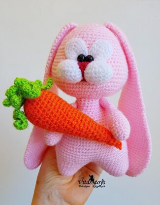 This crochet pattern contains a detailed description of how to create Bunny (Rabbit), with a great amount of step-by-step photos and a list of necessary materials. Materials needed to create a 6.7inch (17cm) tall toy: ●Main color yarn –pink, Beatriz, acrylic, 100g +/-350m or 381 yds. (one skein) ●Yarn for eyes and cheeks -white: Beatriz acrylic 100g +/-350m, (a little) ●Yarn for the carrot -orange and green: Beatriz acrylic 100 g, +/-350 m, (a little) ●Yarn for the nose and mouth -red: Cotton 75g +/-311m (a little) ●Crochet hooks: 1.25mm, 2.5mm, 3.0mm (or any other in accordance with the yarn you use). ●Tapestry needle, scissors, pliers. ●Soft stuffing (like cotton wool, hollow fiber, polyfill, etc.). ●Eye beads: Ø 0.5cm -2 pcs.