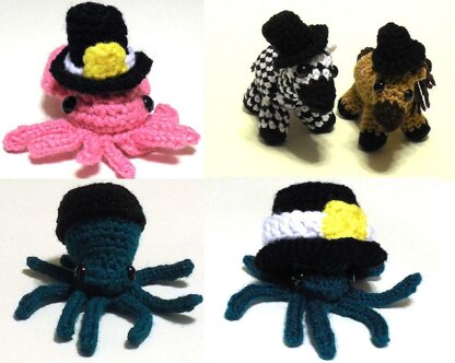 Need a hat for your small animals and stuffed toys? Then this is the pattern set for you!. This set includes a large pilgrim hat, large russian hat, small bowler hat, small top hat, and small pilgrim hats patterns.