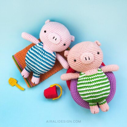Materials: - DMC Natura Just cotton yarn (50 g /155 m): * Pig with green and white swimsuit Yarn A Pink (Labelia 82) Yarn B Green (Chartreuse 48) Yarn C White (Ibiza 01) Yarn D Purple (Malva 31) Yarn E Orange (Safran 47) Yarn F Red (Passion 23) Yarn G Yellow (Giroflée 85) - 2.5 mm (B-1) crochet hook - Black beads or safety eyes (about 5 mm diameter) - Black embroidery yarn - Tapestry needle - Stitch markers -Toy stuffing
