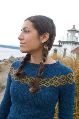 Cropped color work pullover worked seamlessly in the round with circular yoke. Cuffs and hem worked in cable and rib pattern, and short row shaping at back of neck.