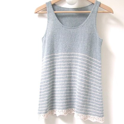 The top is worked bottom-up, seamlessly, and in the round until the underarm, when the front and back are divided and worked separately. For a neat and professional finish, an applied i-cord is worked on the lace edge, while the neckline and armholes are finished with a special firm bind off.
