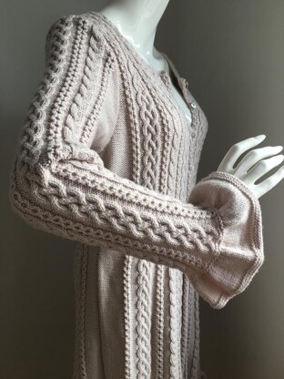 Anael is a beautiful shaped long cardigan, decorated allover with different cables. The valances make it very romantic and feminine. Simply great for feeling like a princess.