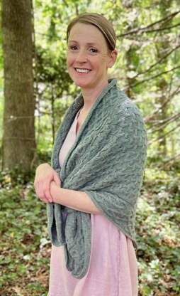 This generously-sized cabled shawl is the perfect extra layer to throw in your bag (or keep in your car!) should that evening barbecue turn chilly, or the clouds emerge during the kid’s sporting event. It has a classic style that has stood the test of time and looks just as good dressed up or down. The extra long shape of the triangle means it will stay put when you drape it over your shoulders, with or without a shawl pin.