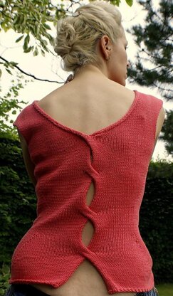 The back shows off skin through the crossings as well as featuring all the decreases for figure shaping. The upper back has a series of decreases on both Right and Wrong sides that creates the curvaceous lines leading to the shoulders.