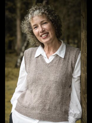 The vest is worked top-down starting with the back, giving you a chance to get familiar with the chart and the pretty texture coming from a combination of knit and purl stitches. Once the back armhole shaping is complete, back stitches are placed on hold and stitches are picked up and worked in the opposite direction for the left front. The left front neckline is shaped through increases and armhole increases mirror the back. Once the left neckline shaping is complete, stitches are picked up for the right front and the armholes shaping completed prior to joining the front and back. The rest of the work is done in the round finished with 5cm of 1/1 rib. The final touches are the addition of 1/1 ribbing at the neckline and each armhole for a tailored and structured finish.