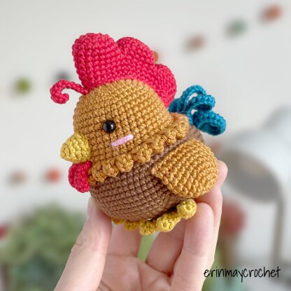 Have you heard? There’s a new chicken in town. His name is Andre the Rooster and he’s the latest chicken to join the flock here at erinmaycrochet! Andre and his lady, Olive, make quite the pair, and can be found strutting around the coop all day long. With his bright bronze plumage and flashy blue tail feathers, Andre is one bird you won’t quickly forget.