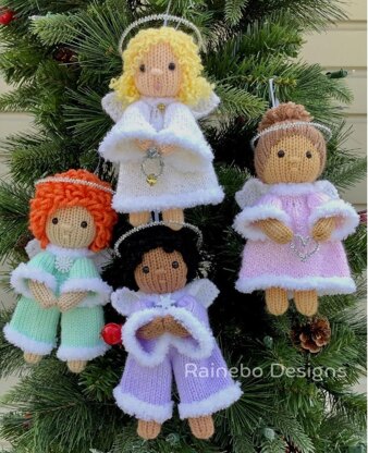 These 4 darling Angel Ornaments are knit in the round, (Intermediate Level), using Magic Loop (or double pointed needles). They are approx. 6 ½” tall and are mostly created using #3-light wt. (DK wt.) yarn. Needles needed: size 3 (3.25mm) 32” Circular Knitting Needles (if using Magic Loop). The legs, body, arms, and head are all knit on as you work along. The clothes are not removable.