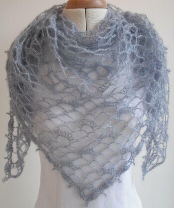 As light as an angel’s wings, this is a soft lacy triangular shawl that is perfect for summer evenings. It has a simple design which is very easy to memorise and very quick to make. It uses less than 50g of laceweight mohair yarn, which helps in ensuring it is light but also warm enough to keep the chill off. The shawl is worked from the bottom point upwards. It is important that you check your tension, this is an open design and requires a fairly loose tension to look good. You may need to increase your hook size to get the correct finish. The pattern has written instructions in both English and US crochet terms.