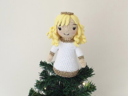 Using the materials suggested this angel measure 16cm (6.25in) tall. Any yarn can be used with this pattern with an appropriate size crochet hook to create a tight tension, although other yarns may affect the size of the finished angel. Suggested materials: DK (8ply) 100% cotton and metallic yarns, 2.5mm crochet hook, toy stuffing and 6mm safety eyes.
