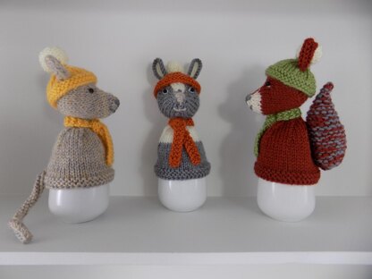 They are simple to make, using stocking stitch and garter stitch. Each cosy has the same basic shape then different detailing is added. The bobble hat is knitted at the same time as the hat then stuffed with toy filling. Each creature has it's own tail shape.