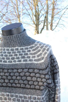 Anker is a sweater/pullover knitted from the bottom edge and up with a 4-color mosaic/smock pattern om the yoke. The sweater has a raglan yoke, long sleeves and rib edges. The pattern is made for at yarn with a gauge of 18 stitches per 10 centimeters (stockinette stitch) i.e. a yardage of approimately 90 meters per 50 grams.