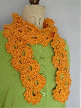This quick, one-skein crochet scarf is an attractive, lightweight accessory casual enough to wear with jeans and pretty enough to wear to a party. This scarf is an easy way to spice up your wardrobe - try a color that matches or contrasts with your favorite outfits! You can sub different yarns for different effects; in the photos you will see a pale pink one done with less than one skein of laceweight mohair blend (Elann Super Kydd) on a size K hook, and a big cream-colored scarf done with a skein of chunky acrylic/wool blend (Lion Brand Wool-Ease Chunky) on a size L hook.
