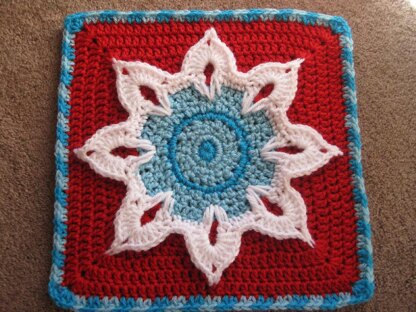 Here is my 12" version of the Sun motif from my September Morning Afghan. Three-dimensional leaves surrounding a textured center, on a solid double-crochet base. Final round in tapestry crochet technique.