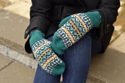The Anstruther Mitten begins with an elegant, but warm lace cuff which is knit flat and then seamed using a three-needle bind-off. Stitches are picked up from the edge and then the mitten is worked in the round with an after-thought thumb. Shown here in the bright colors of the harvest, this mitten would also be lovely done up in neutral shades of black and grey.