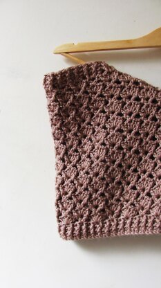 Gentle waves of sand form beneath the surface of the sea's rolling waters, reflected in the soft, wavy texture of this cowl, created with front post stitches.
