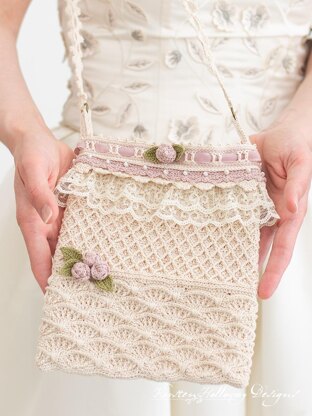 This vintage-style lace wedding bag is a beautiful accessory that the bride will treasure for many years! It is accented with lace, ribbon, and pearls, as well as small roses with delicate leaves.