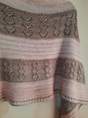 This is a very simple crescent shaped shawl with lots of relaxing garter and stockinette stripes, alternating in both colour and texture to keep the knitter’s interest to see how the different combos come out. There are also panels of lace and twisted stitches to make it a striking yet delicate soft pretty piece. I used a slightly plumper than usual fingering weight yarn in a wool / cashmere blend for that soft floofy drape in delicate neutral shades for a gentle palette, but any soft wool based / blend yarn of your choice should work fine. You can play with yarn weights, just remember different gauge can change the required yarn amounts/finished measurements.