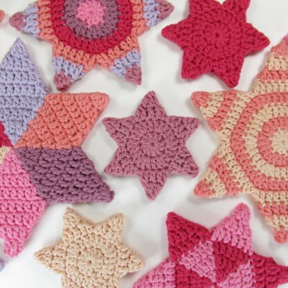 Stars which can be crocheted in any size and used to make decorations, baubles, hanging ornaments, bunting, mobiles and more. They can be made using any weight of yarn in a single colour or multi-coloured stripes or wedges, making it a good stashbuster project.