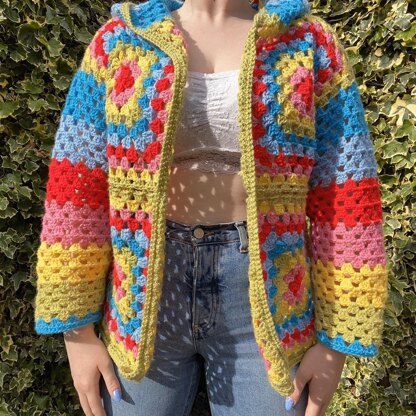 The squares are joined as you go, so there’s no seaming afterwards. The sleeves are worked in the round downwards from the shoulder to the cuff. The hood is worked upwards in one piece and there’s a short seam to close the top of the hood. This seam is worked in ss and can’t be seen, even when the hood is down. This pattern is great for using up yarn scraps.