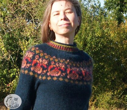 Design details: ● long pullover with ligth A-line ● seamless, worked in one piece ● worked from the bottom up to the underarm ● round colorwork yoke with 2 and 3 colors patterns ● long sleeve ● sleeves worked in the round ● darts for Size M – 3XL ● short rows are added to shape the neckline ● 3 colors-borders