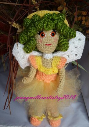 This pretty, little fairy is the next in my line of pose-able fairies. Dressed in yellow and peach, she reminds us of the first flowers of spring. She is one of a series--there will be one for every month of the year.