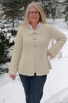 This sweater is in one size only because of the unique combination of cables. Additional sizes can be worked with different needle sizes and yarn weights.