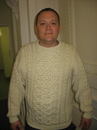 The pullover is an exercise in cable construction, offered in sizes S-XL, (38"-52", finished chest).