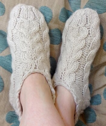 A twist on the Aran theme, I love the idea of the fisherman’s uniquely, beautifully patterned jumper. A present of such a jumper, all the way from Stromness, led to this design which incorporates the herringbone style cables that form part of that Jumper’s amazingly intricate pattern. Made with 50% wool and 50% acrylic, these slippers will keep your feet nice and warm whilst at the same time be hardwearing and machine washable. The slippers are made in the round with herringbone cable design over the top and heel. The soles are purled.