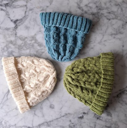 The Aran Watchcap takes its name from the Aran Islands, Ireland – where I am proud to come from! The hat features a warm folded brim, perfect for keeping woolly warmth around the face and ears. A richly textured cable creates extra thickness in the main body of the hat. The cable draws in the fabric of the hat to the extent that I would suggest knitting this hat in a larger size than you would usually choose.