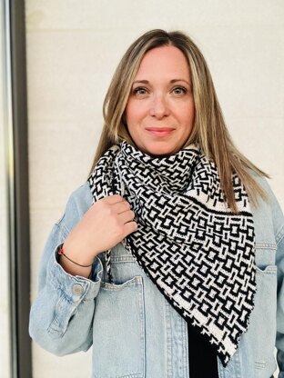 This two-color, asymmetrical triangular shawl features an elegant all-over geometric pattern created through Mosaic Knitting. Worked flat in garter stitch, it uses only one color at a time with increases worked along one edge to shape the shawl. When selecting colors for Mosaic Knitting, it is best to choose high-contrast combinations to make the geometric pattern stand out.