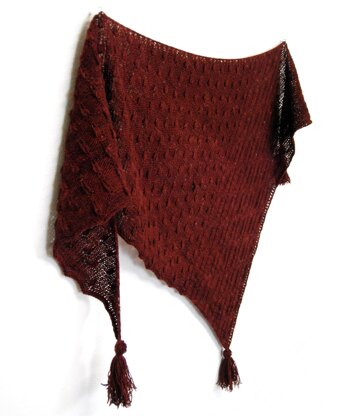 The shawl is worked on the bias with increases always placed along the same edge. The other two edges remain straight throughout the entire shawl. The shawl is framed with an i-cord edging that gives it a finished look. Tassels attached to each of the three corners add to the rustic charm.