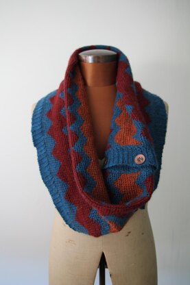 Arete is a colour-work cowl, crocheted in the round and then steeked (cut up the steek stitches). It can either be worn as a flat cowl with a twist, covering your shoulders and neck, doubled over on the inside to create a chunky neck cowl.